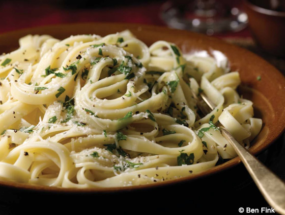 4. Transfer the fettuccine to the saucepan with the butter mixture. Add the salt, pepper, and parsley. Return the saucepan to low heat. Toss, adding enough of the pasta water to make a glossy sauce that isn’t watery or gluey. Remove from the heat, sprinkle with the cheese, and serve immediately.
